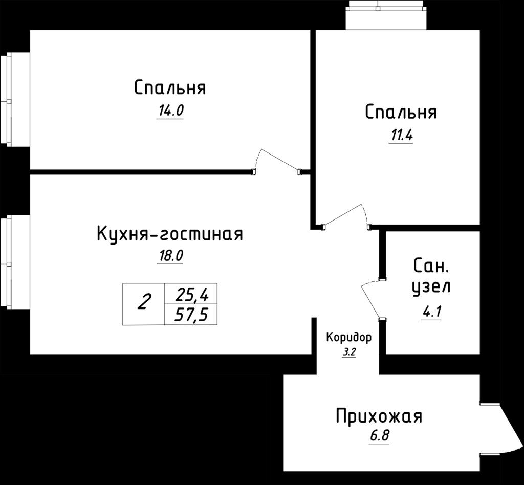 В продаже двухкомнатная квартира, S - 57.5 кв.м.