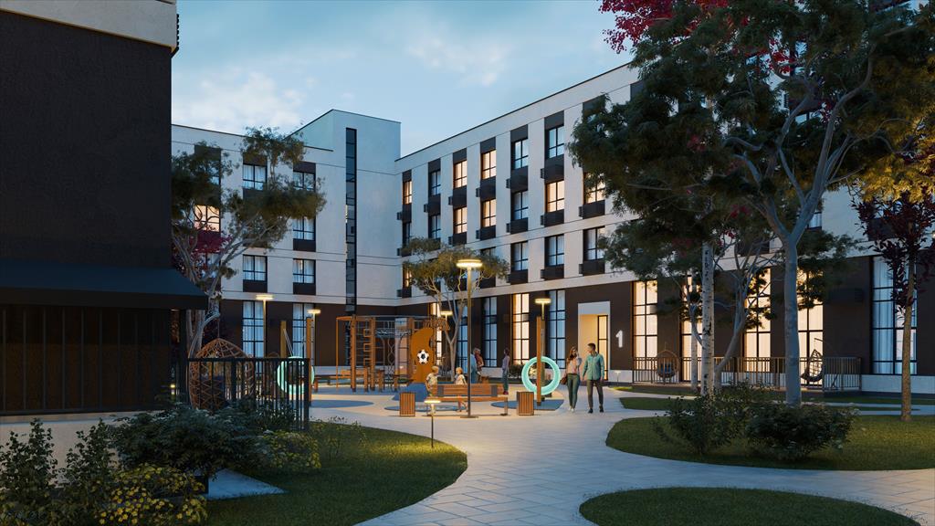 Во дворе дома закрытый двор с игровой площадкой для детей, разделенной по возрастам с уголками и площадками, оборудованными для различных активностей. Архитектурные формы и места общего пользования разработаны с уважением к природе.