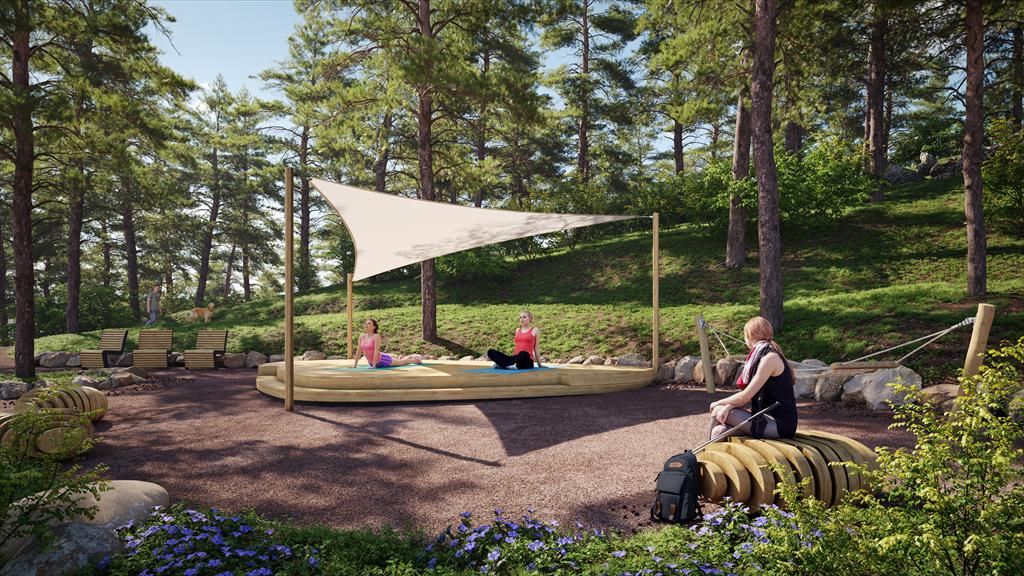 Спортивно-оздоровительный кластер: площадка для йоги и дыхательных гимнастик, тропы терренкур, баскетбольные и волейбольные площадки, workout, теннисный корт, беговые дорожки.