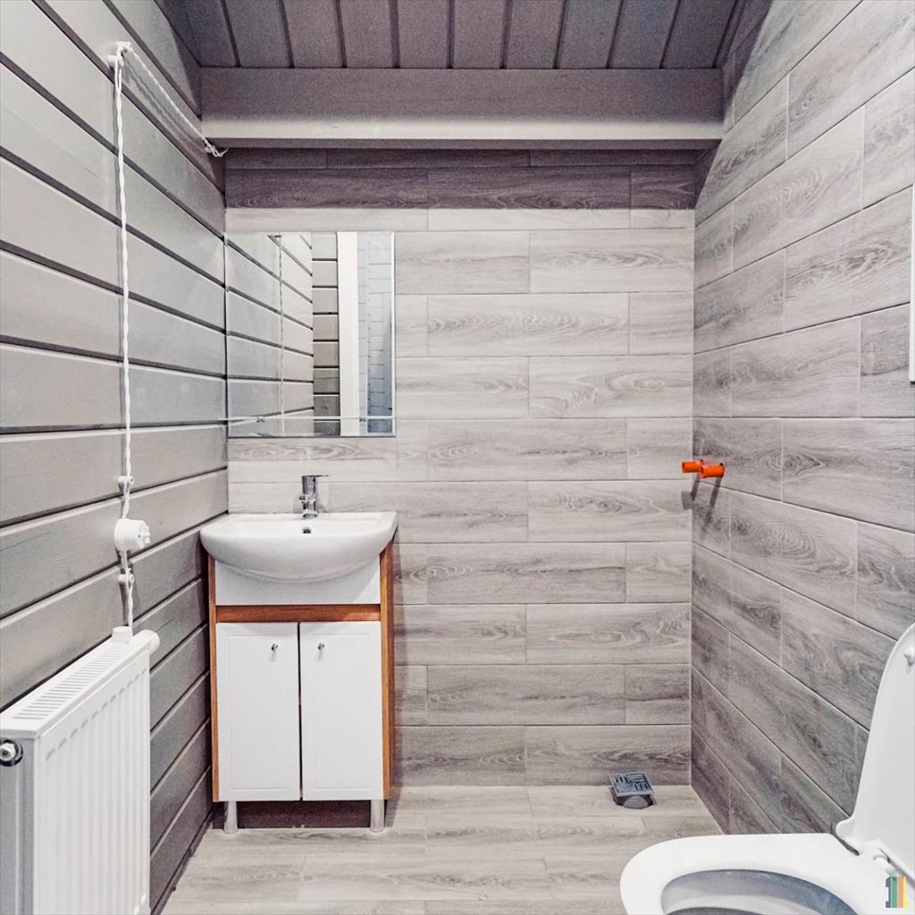 На 1-м этаже большая комната с залом и местом под камин, спальная (или веранда), большая газовая котельная, в которой можно разместить стиральную машину и т.п.. Есть сауна, зона отдыха у сауны . На втором этаже - три спальных комнаты и комната -салон. На каждом этаже санузлы с душевыми. Навес на два автомобиля.