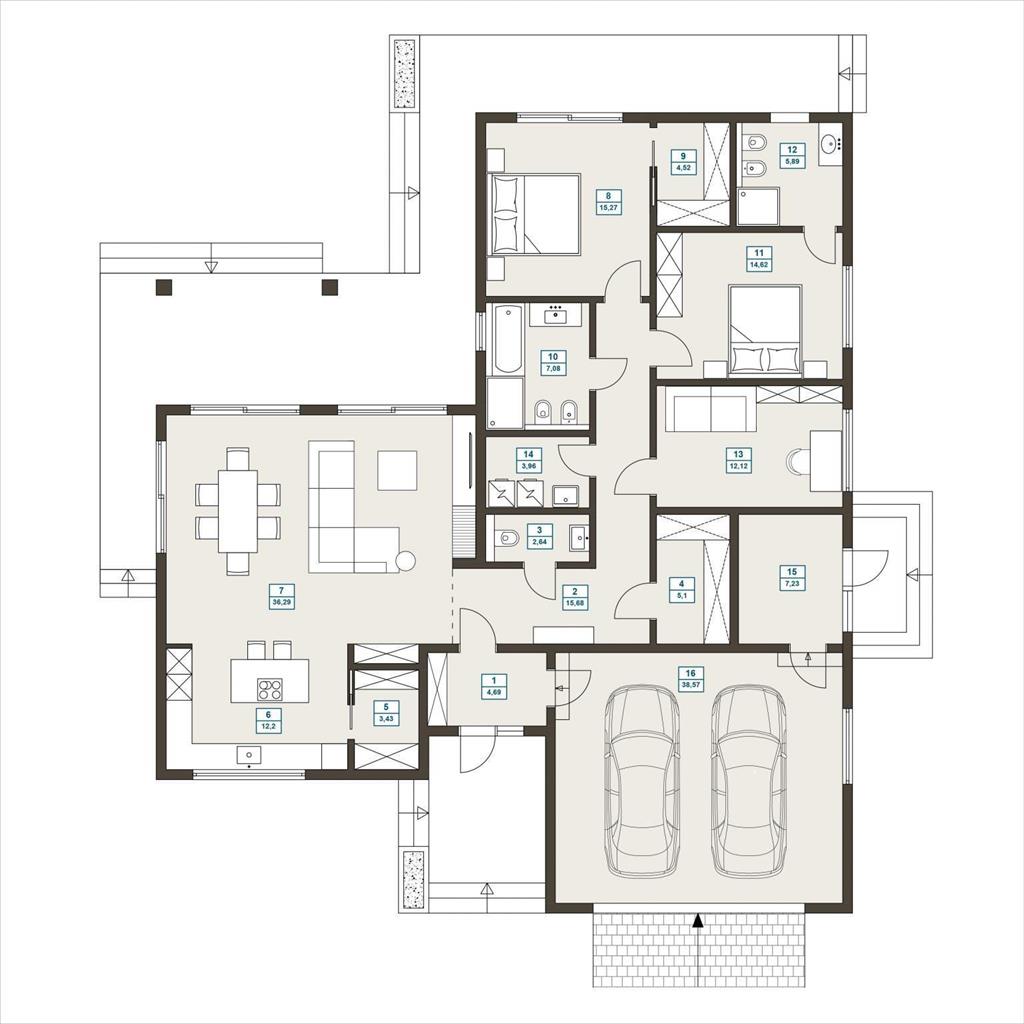В доме есть выход в тёплый гараж на два автомобиля и помещение для котельной.