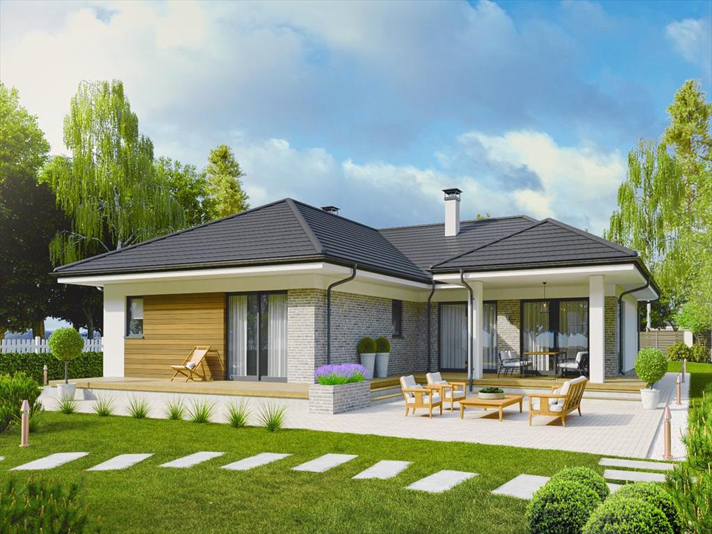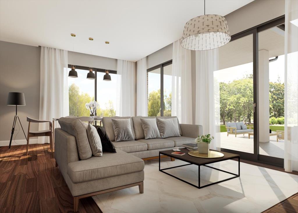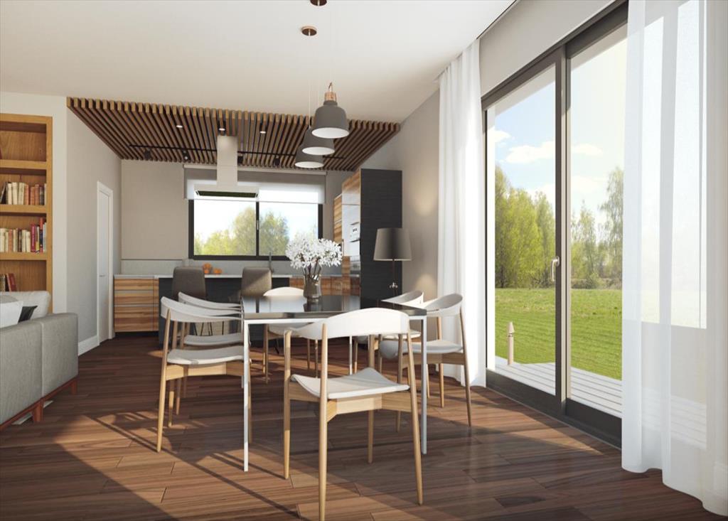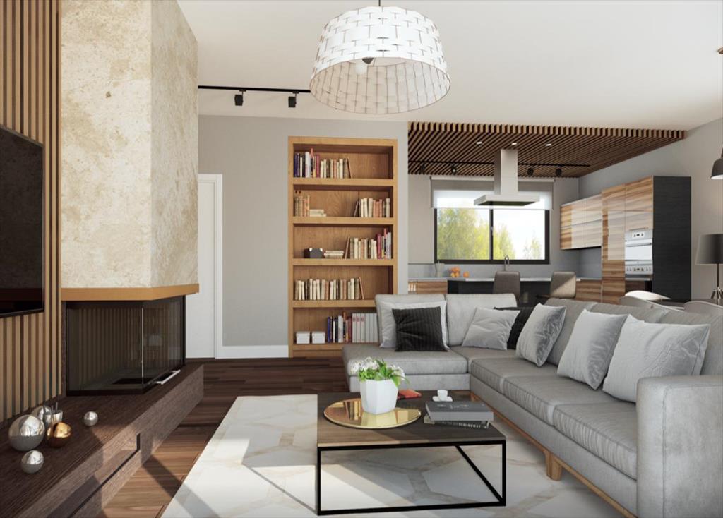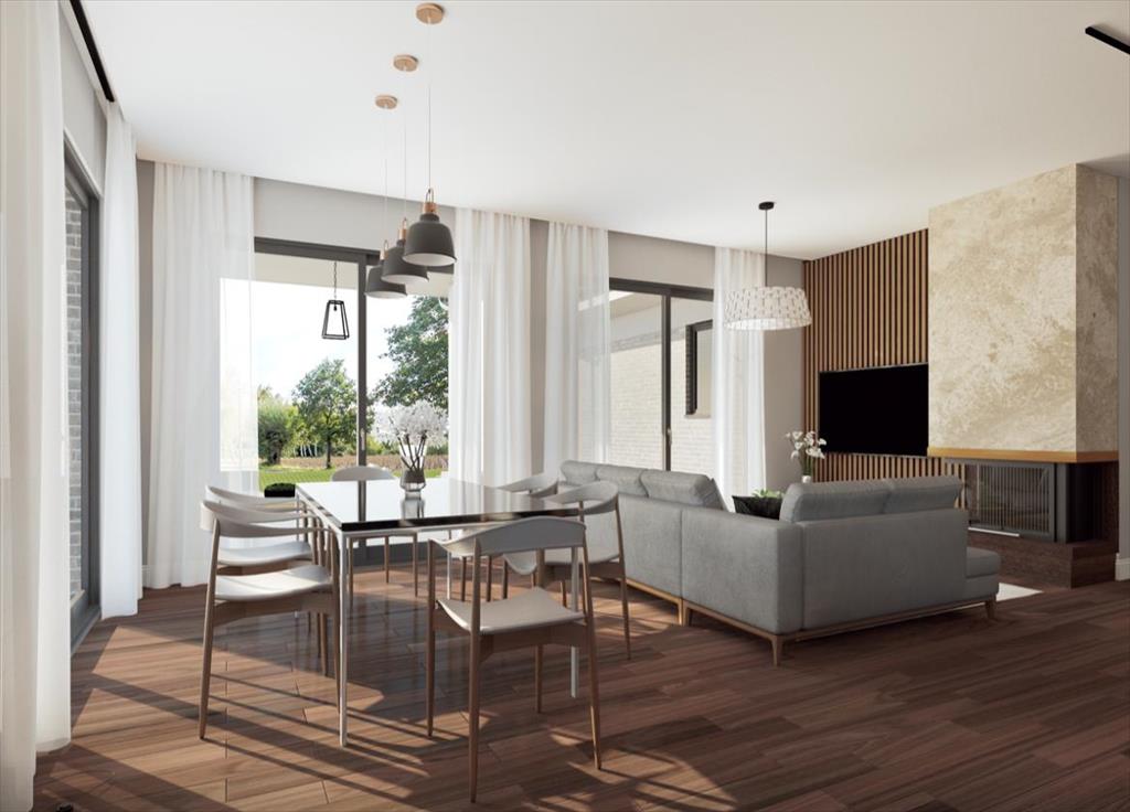 Большая светлая гостиная-столовая с камином и панорамными окнами имеет выход на крытую террасу.