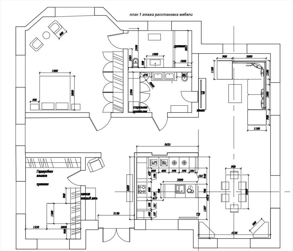1 этаж: Большая гостиная, Кухня, Гардеробная, Спальня, Санузел (плитка закуплена).
