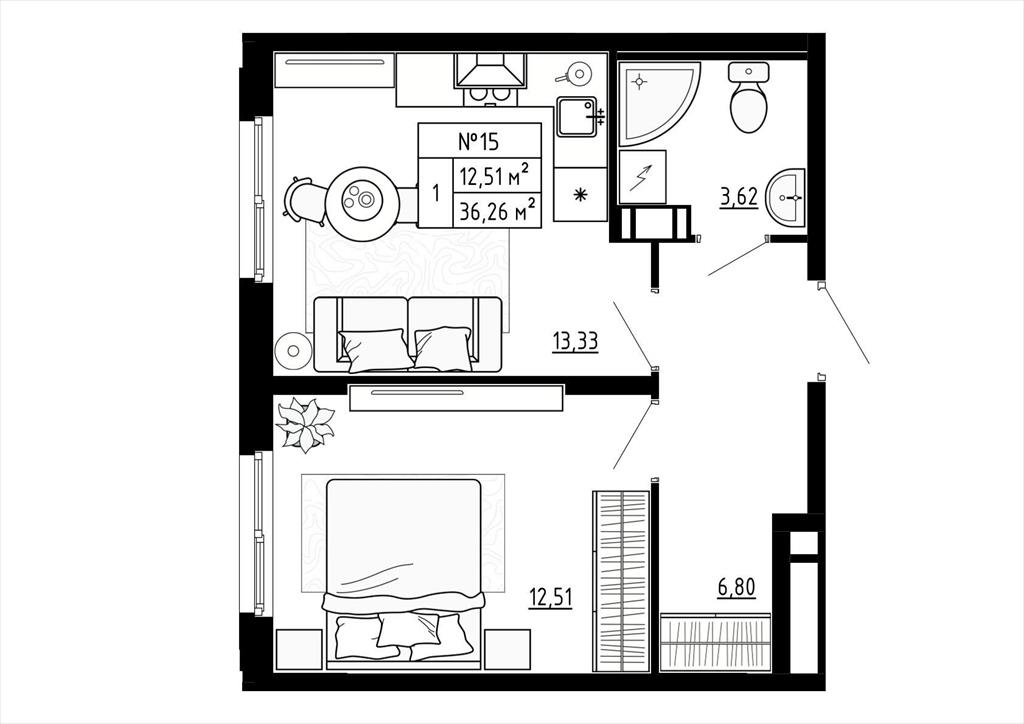 общая 36,26 м2, жилая 29,01 м2, кухни 0 м2 |