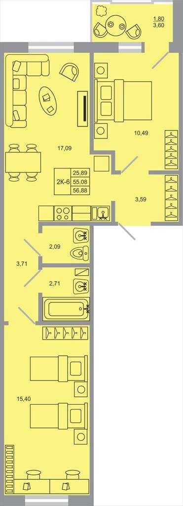 общая 56,88 м2, жилая 25,89 м2, кухни 17,09 м2 |