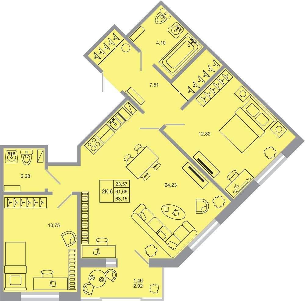 общая 63,15 м2, жилая 23,57 м2, кухни 24,23 м2 |