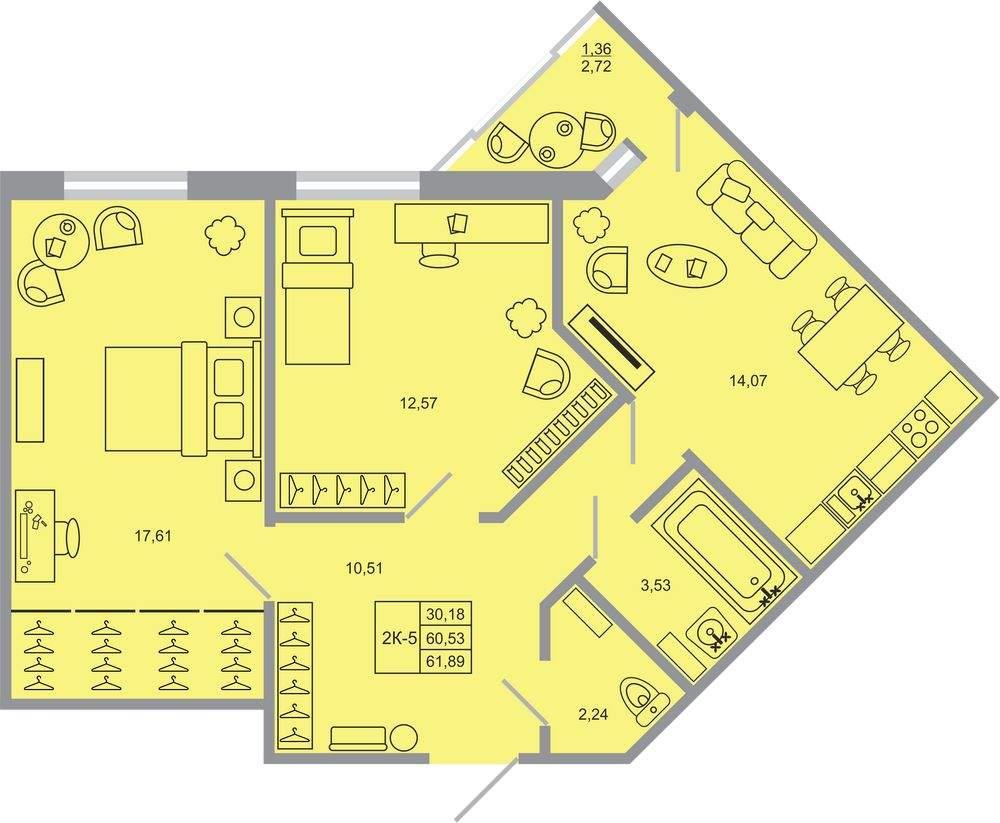 общая 61,89 м2, жилая 30,18 м2, кухни 14,07 м2 |