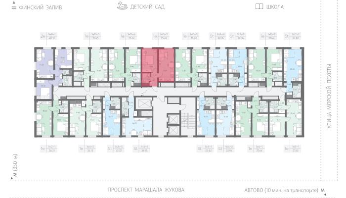 Квартира располагается на 18 этаже 23-этажного дома в ЖК Морская миля.