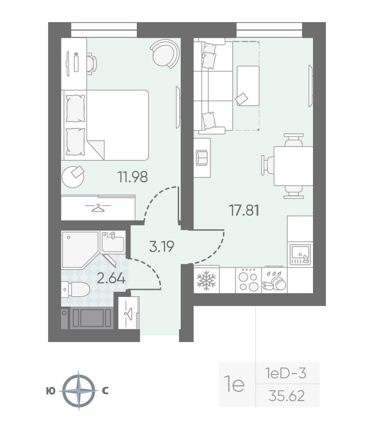 общая 35,74 м2, жилая 12,37 м2, кухни 17,35 м2 |
