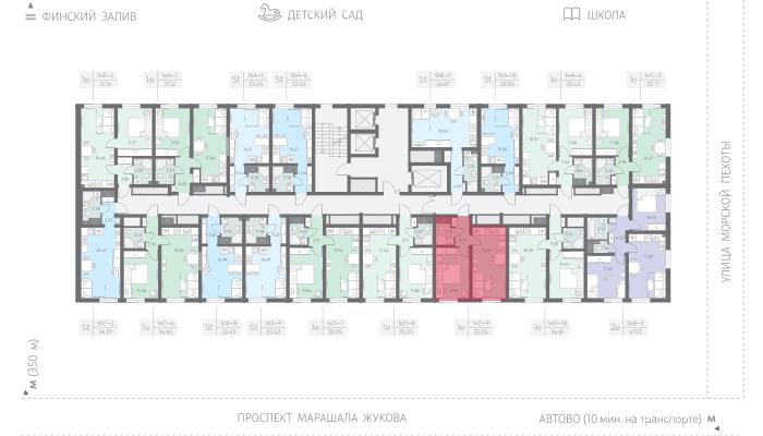 Квартира располагается на 4 этаже 23-этажного дома в ЖК Морская миля.
