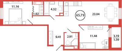 общая 65,79 м2, жилая 22,6 м2, кухни 0 м2 |