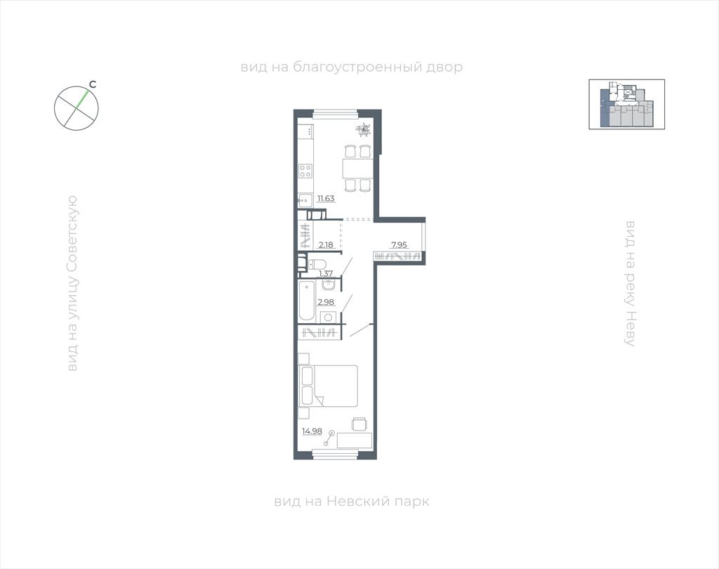 Жилая площадь 14.8 м2, кухня 11.4 м2, чистовая отделка. Предчистовая отделка, чистовая отделка., балконов - нет, окна выходят во двор и на улицу.