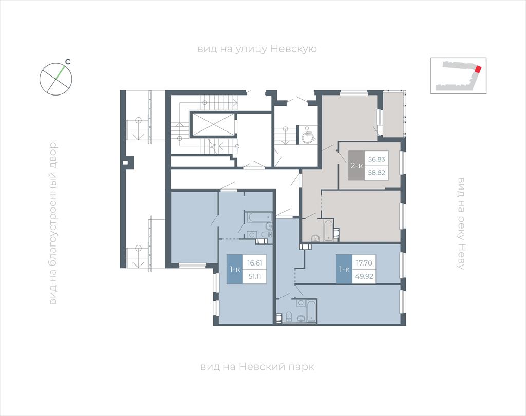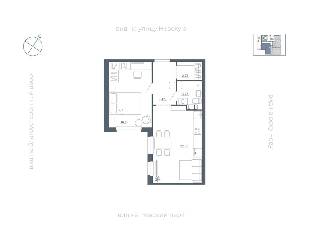 Жилая площадь 16.3 м2, кухня 22 м2, чистовая отделка. Предчистовая отделка, чистовая отделка., балконов - нет, окна выходят во двор.