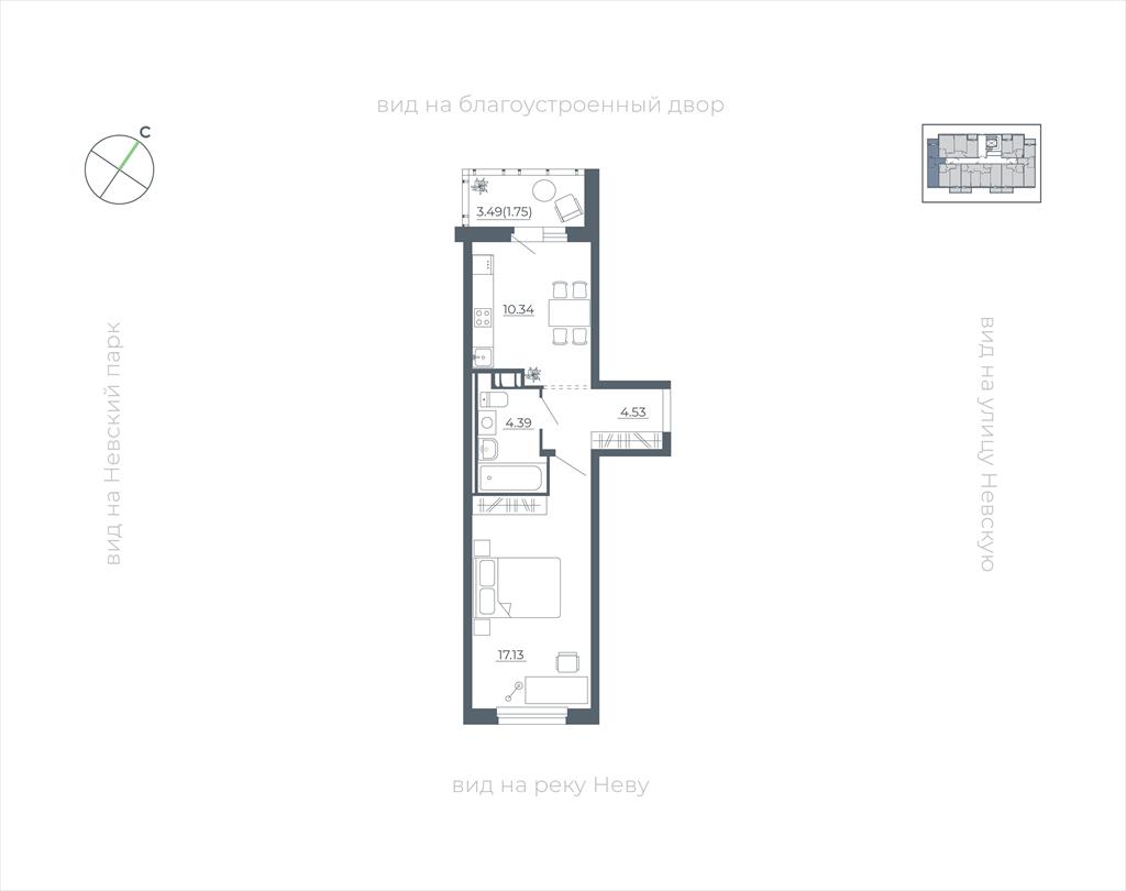 Жилая площадь 17.1 м2, кухня 10.2 м2, чистовая отделка. Предчистовая отделка, чистовая отделка., окна выходят во двор и на улицу.