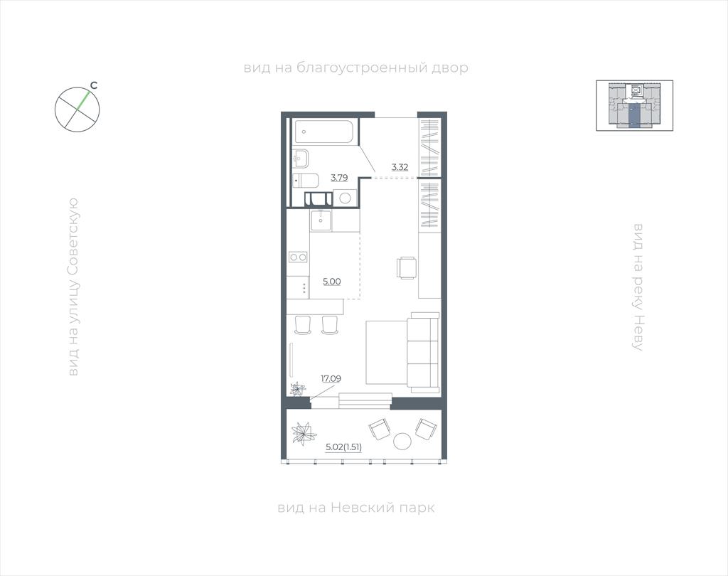 Жилая площадь 16.8 м2, кухня 5 м2, чистовая отделка. Предчистовая отделка, чистовая отделка., балконов - 1, окна выходят на улицу.