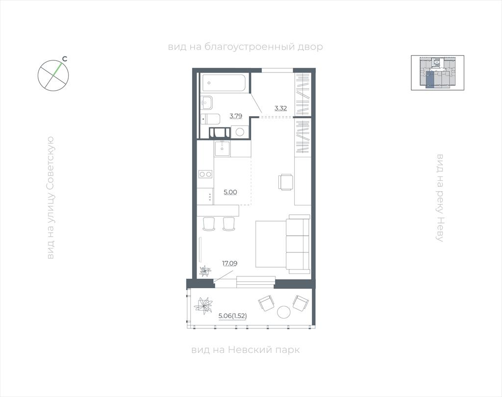 Жилая площадь 16.8 м2, кухня 5 м2, чистовая отделка. Предчистовая отделка, чистовая отделка., балконов - 1, окна выходят на улицу.