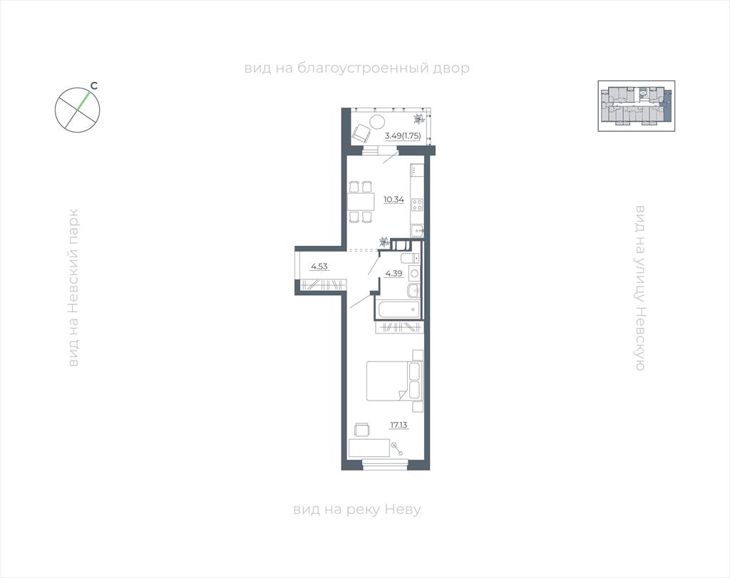 Жилая площадь 17.1 м2, кухня 10.2 м2, чистовая отделка. Предчистовая отделка, чистовая отделка., окна выходят во двор и на улицу.