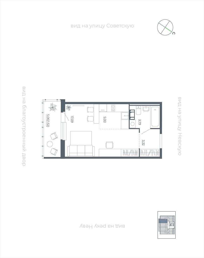 Жилая площадь 16.8 м2, кухня 5 м2, чистовая отделка. Предчистовая отделка, чистовая отделка. , балконов - 1, окна выходят во двор.