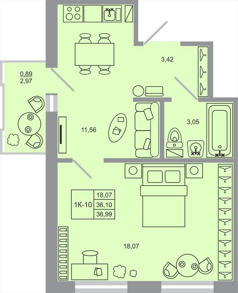 общая 36,99 м2, жилая 18,07 м2, кухни 11,56 м2 |