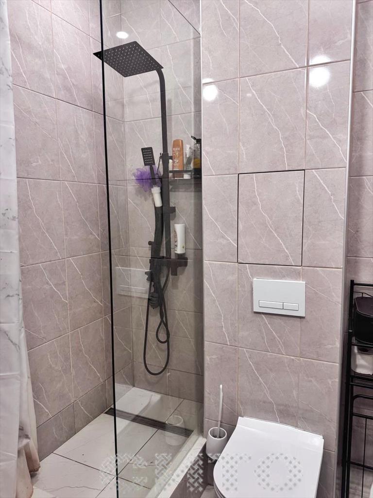 Стильная ванная с черной сантехникой, душем, стиральной машиной и продуманными системами хранения