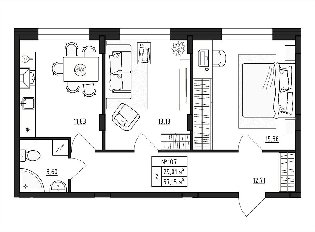 общая 57,15 м2, жилая 29,01 м2, кухни 11,83 м2 |