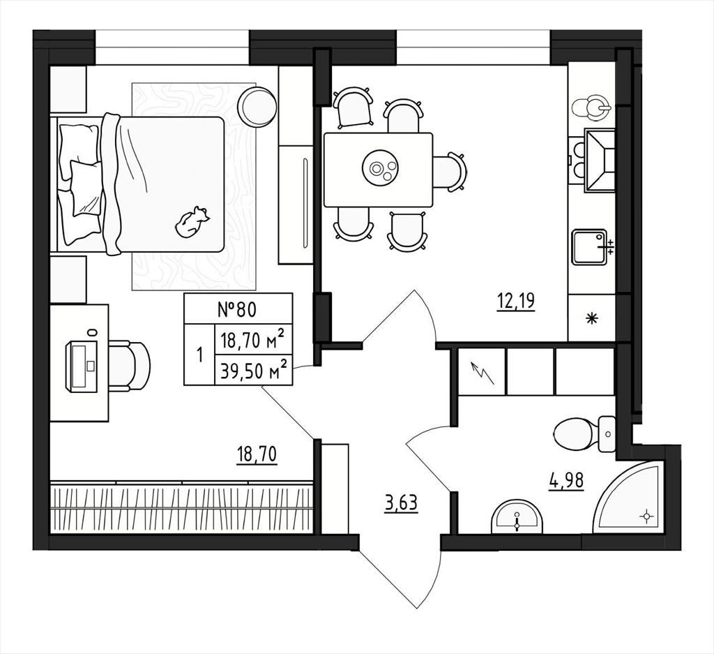 общая 39,5 м2, жилая 18,7 м2, кухни 12,19 м2 |