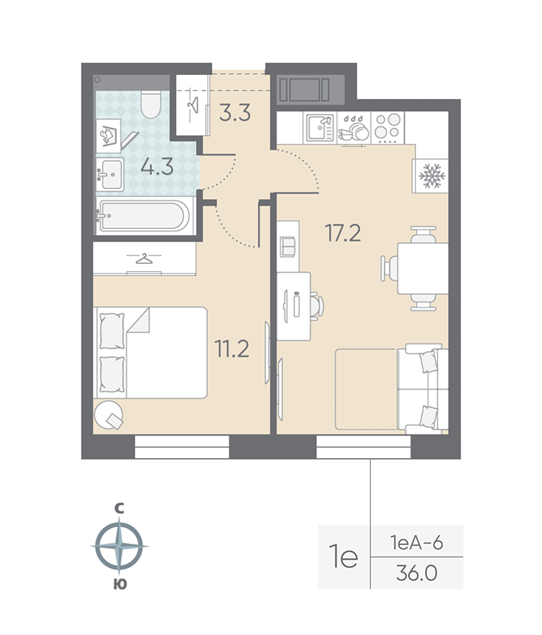 общая 36 м2, жилая 11,2 м2, кухни 17,2 м2 |