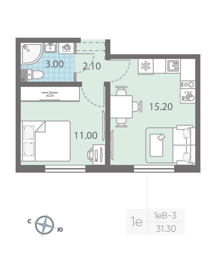 общая 31,3 м2, жилая 11 м2, кухни 15,2 м2 |