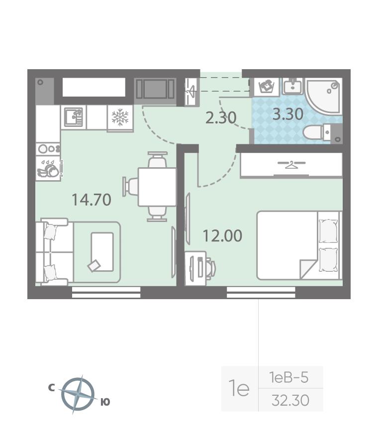 общая 32,3 м2, жилая 12 м2, кухни 14,7 м2 |