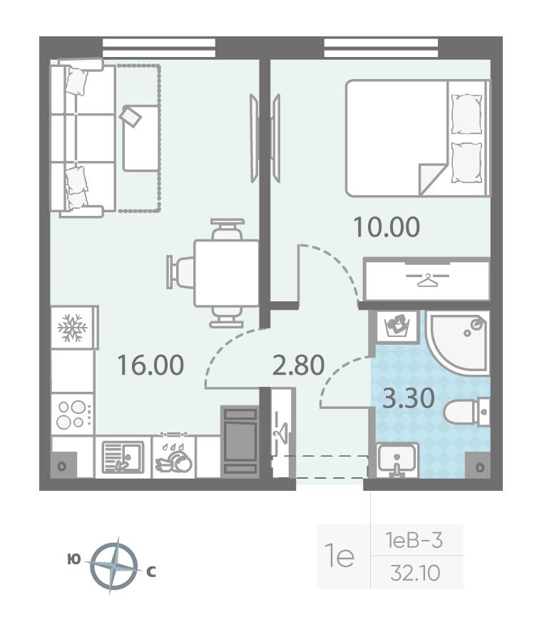 общая 32,1 м2, жилая 10 м2, кухни 16 м2 |