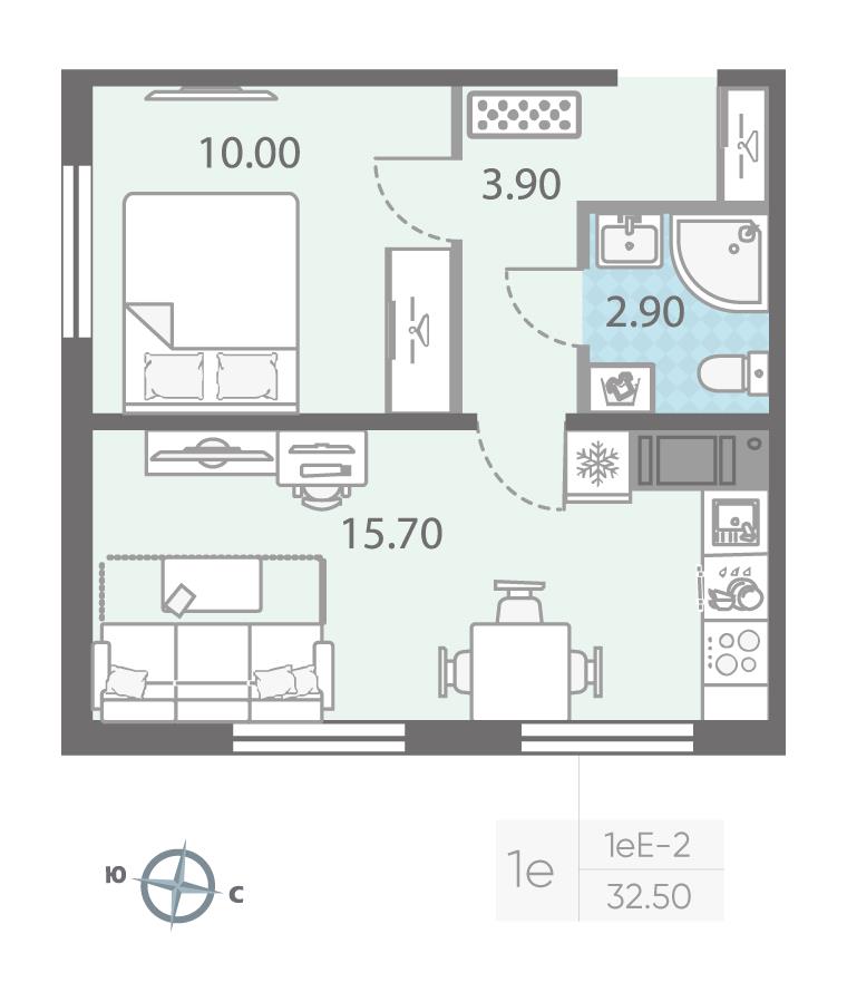 общая 32,5 м2, жилая 10 м2, кухни 15,7 м2 |