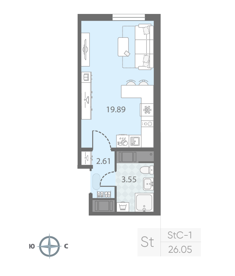 общая 26,05 м2, жилая 14,51 м2, кухни 5,38 м2 |