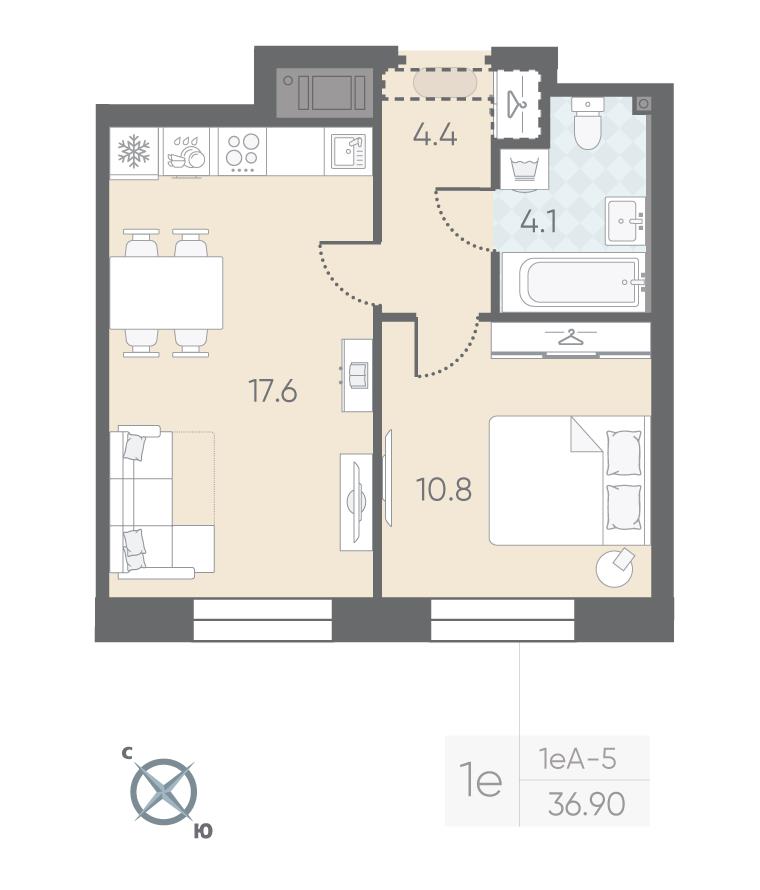 общая 36,9 м2, жилая 10,8 м2, кухни 17,6 м2 |