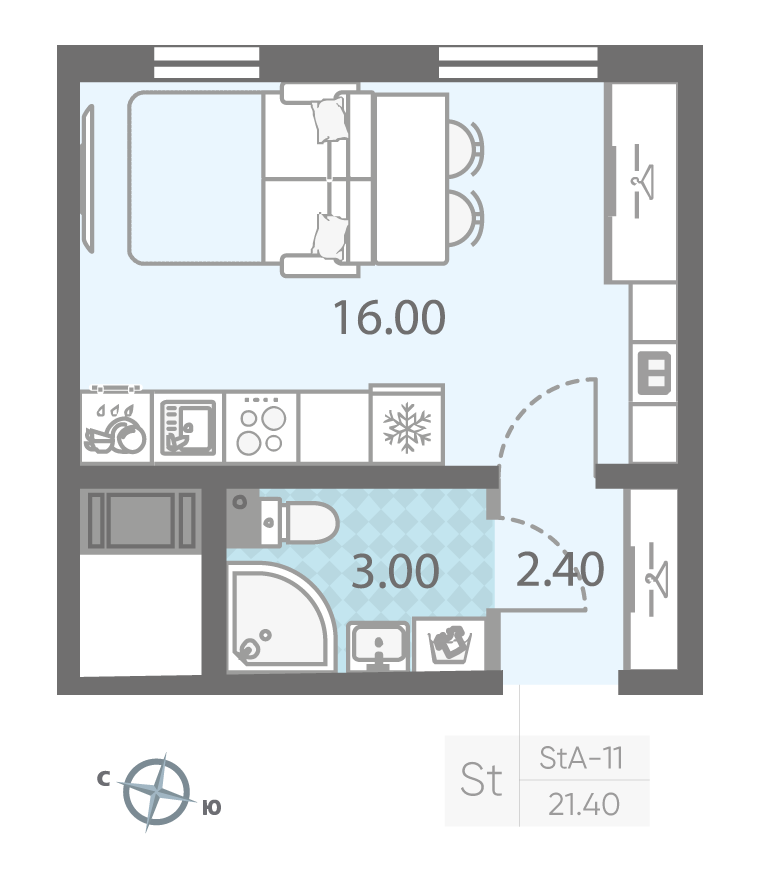 общая 21,4 м2, жилая 10,5 м2, кухни 5,5 м2 |