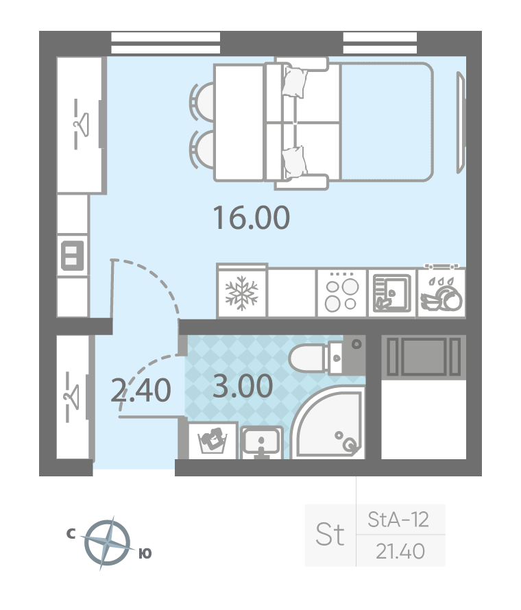 общая 21,4 м2, жилая 10,5 м2, кухни 5,5 м2 |