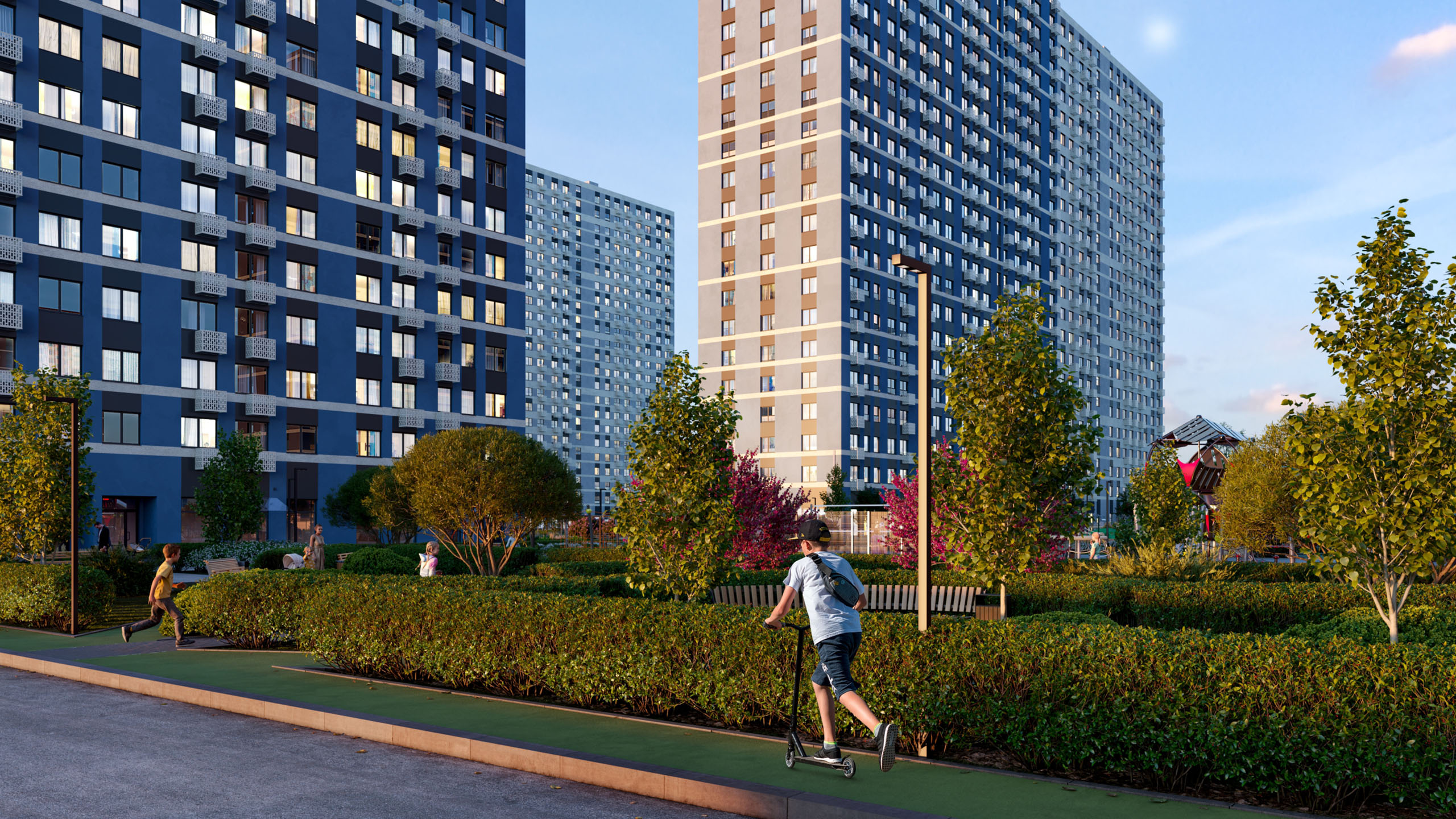 Подземная парковка. Инфраструктура: школа, детский сад, поликлиника, детские площадки, спортивные площадки, места для отдыха, супермаркет, рестораны.