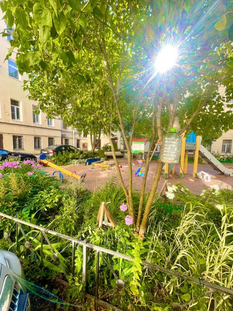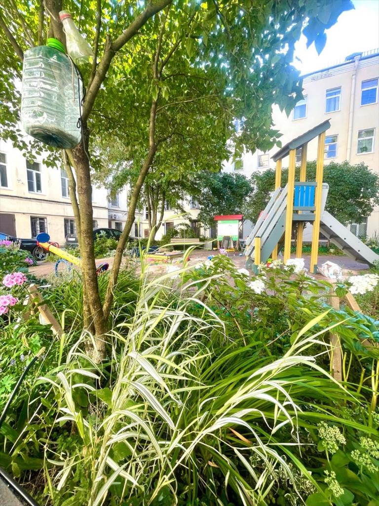 Ухоженный благоустроенный зеленый двор с детской площадкой.