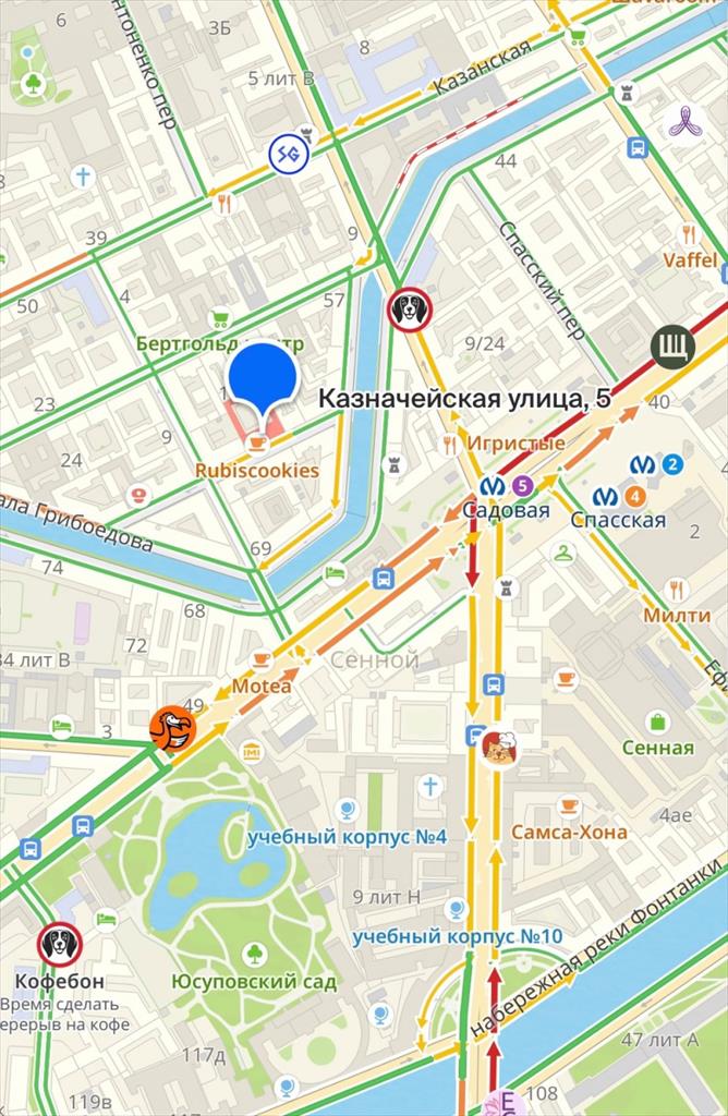 Улица Казначейская, протяженностью 250 м, проходит прямой линией от набережной канала Грибоедова между Демидовым и Сенным мостами и упирается в набережную того же канала между Кокушкиным и Вознесенским мостами.