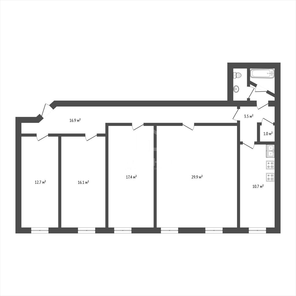Высокие потолки (3,2 м) , комнаты изолированные с окнами на улицу. Жилая площадь составляет 76,1 кв. м, площадь кухни - 10,7 кв. м, а комнаты имеют площади 29,9 + 17,4 + 16,1 + 12,7 кв. Планировка позволяет адаптировать пространство под свои вкусы.