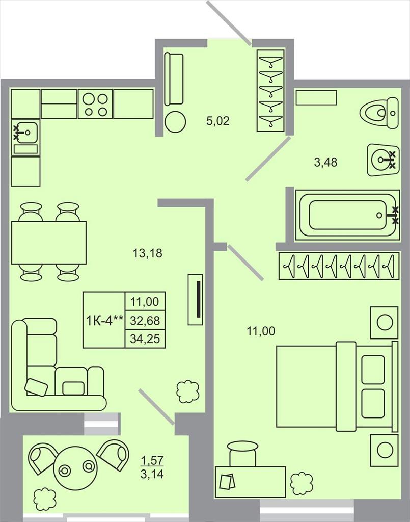 общая 34,25 м2, жилая 11 м2, кухни 13,18 м2 |