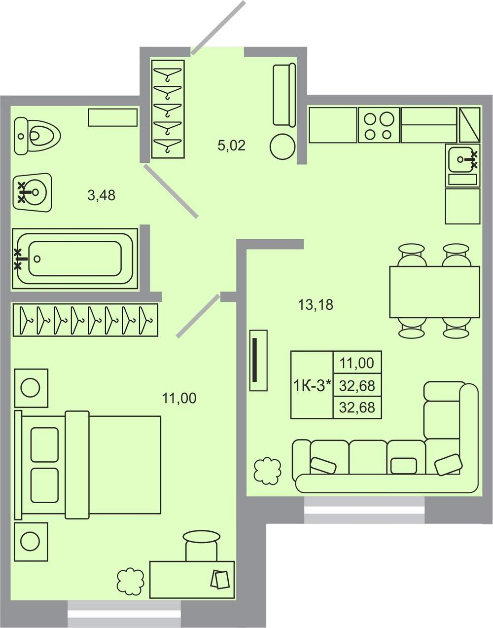 общая 32,68 м2, жилая 11 м2, кухни 13,18 м2 |