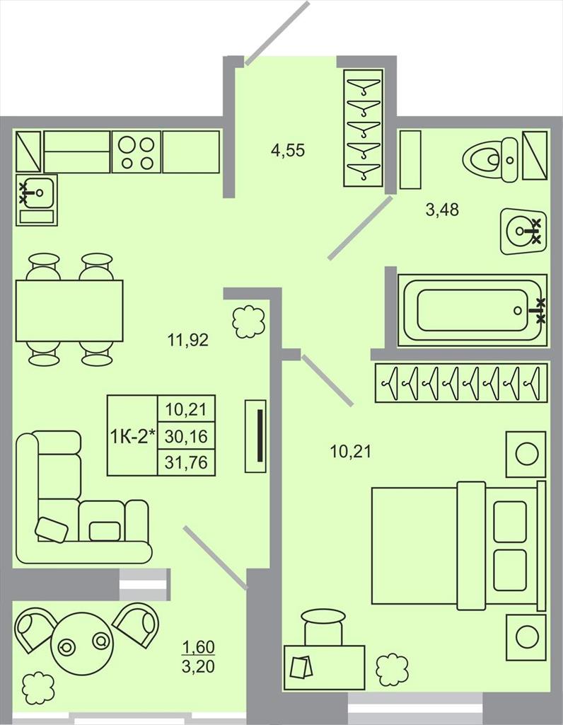 общая 31,76 м2, жилая 10,21 м2, кухни 11,92 м2 |