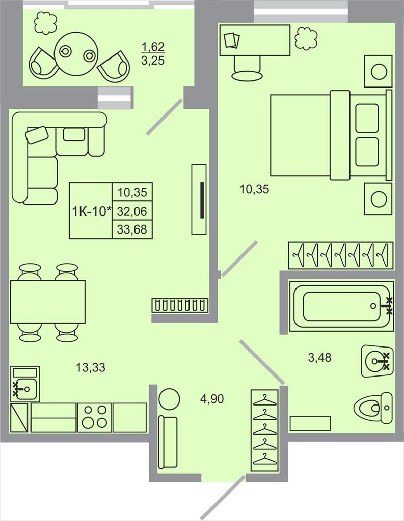 общая 33,68 м2, жилая 10,35 м2, кухни 13,33 м2 |
