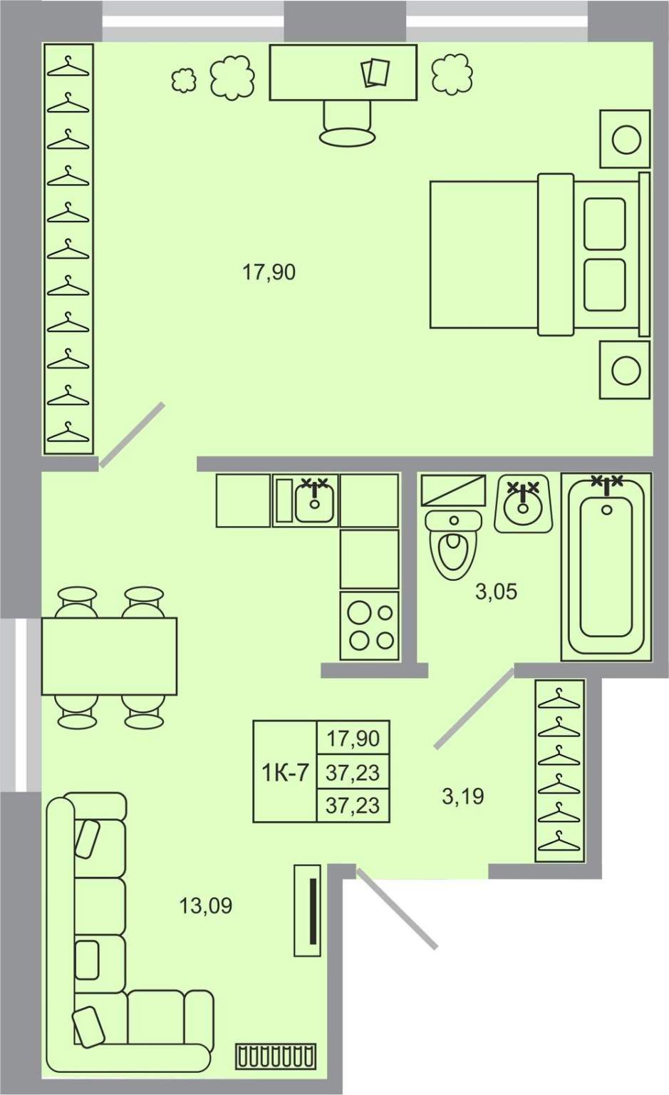 общая 37,23 м2, жилая 17,9 м2, кухни 13,09 м2 |