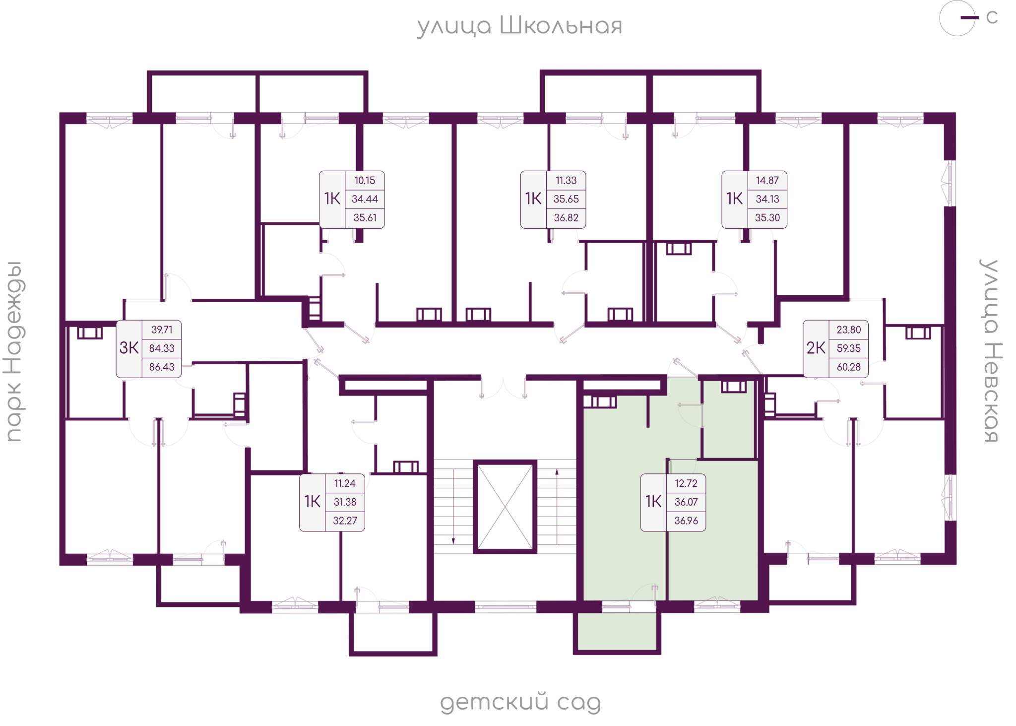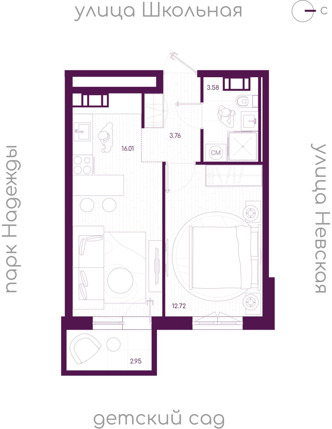общая 36,96 м2, жилая 12,72 м2, кухни 16,01 м2 |
