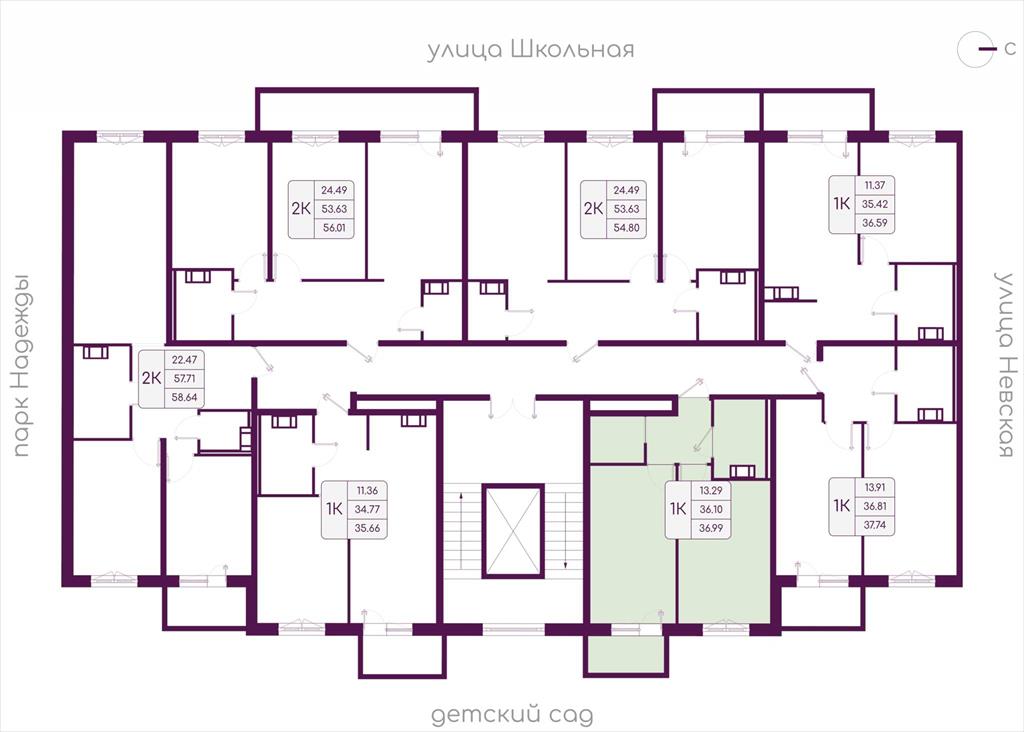 общая 36,99 м2, жилая 13,29 м2, кухни 13,19 м2 |