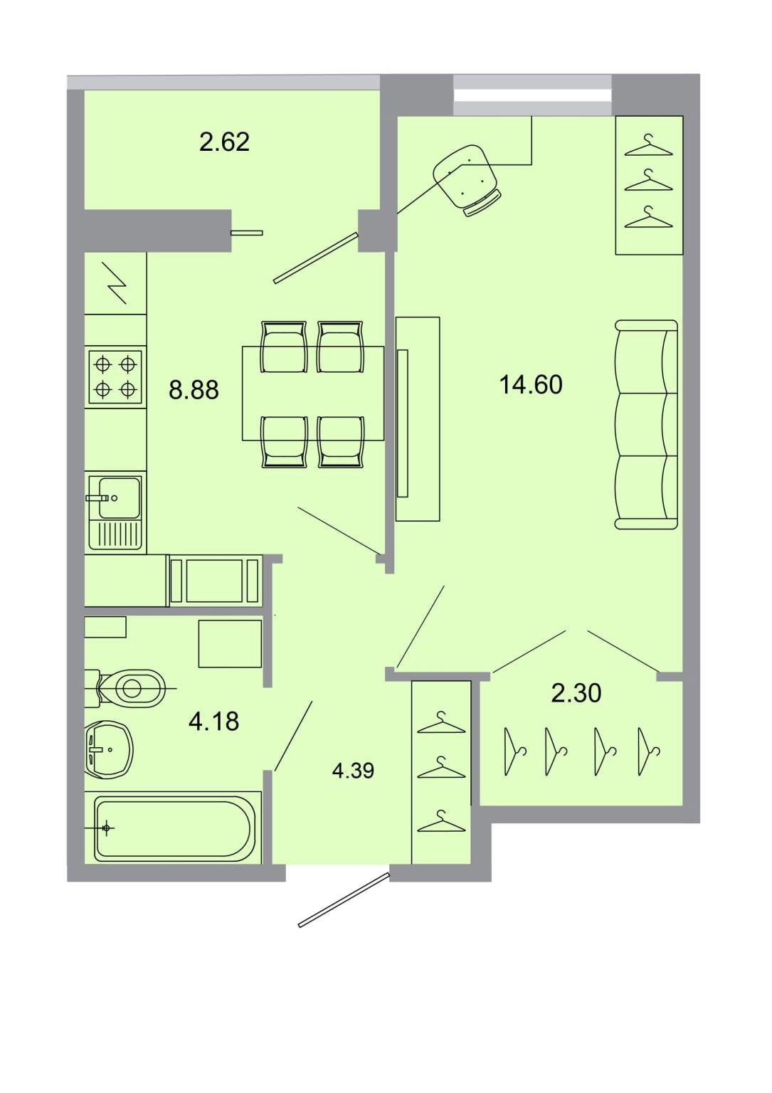 общая 34,8 м2, жилая 16,5 м2, кухни 8,7 м2 |