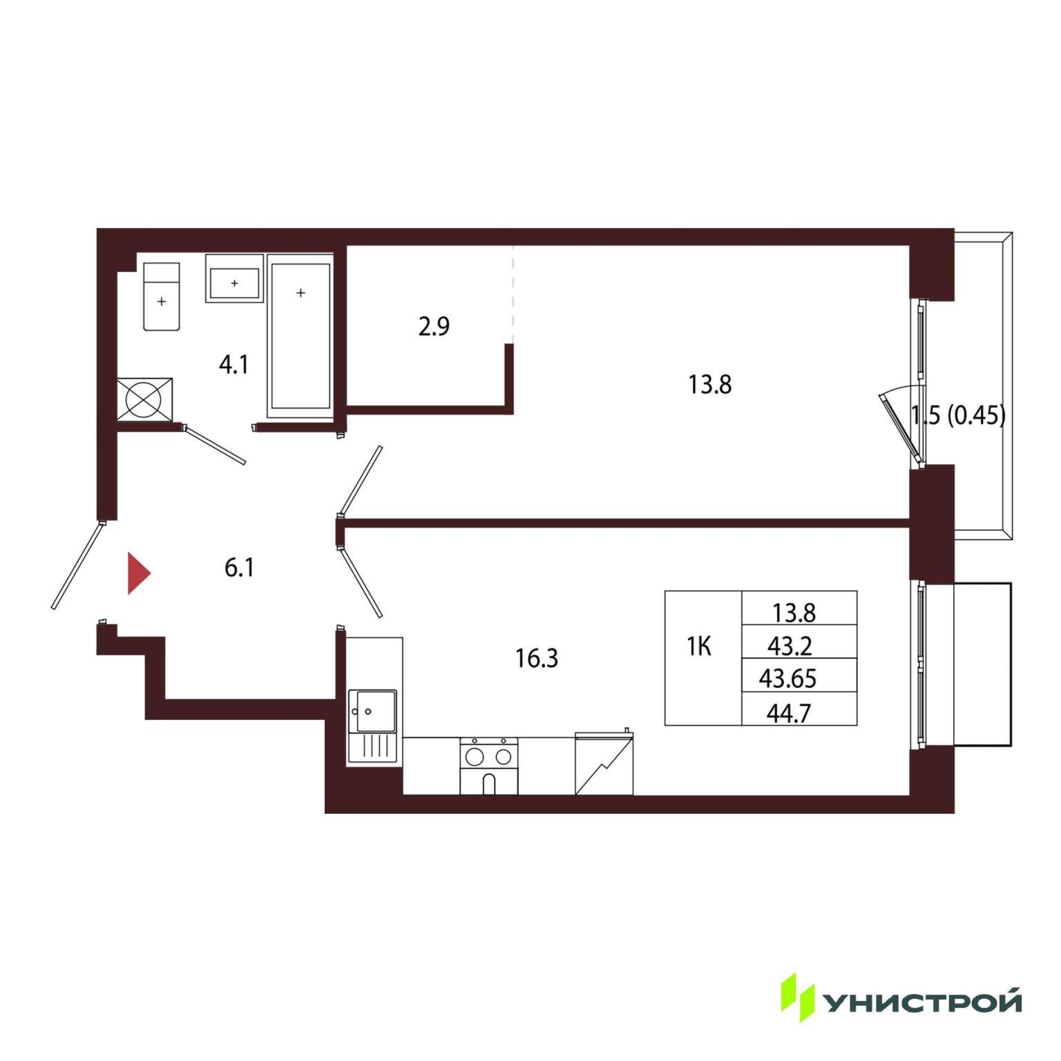 Однокомнатная квартира 43,65 м2 по ул. Сестрорецк Авиационная улица,1 за 14390000 руб. |