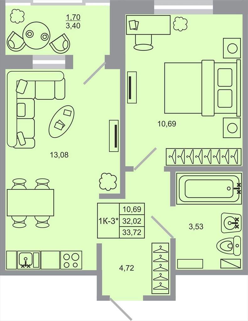 общая 33,72 м2, жилая 10,69 м2, кухни 13,08 м2 |