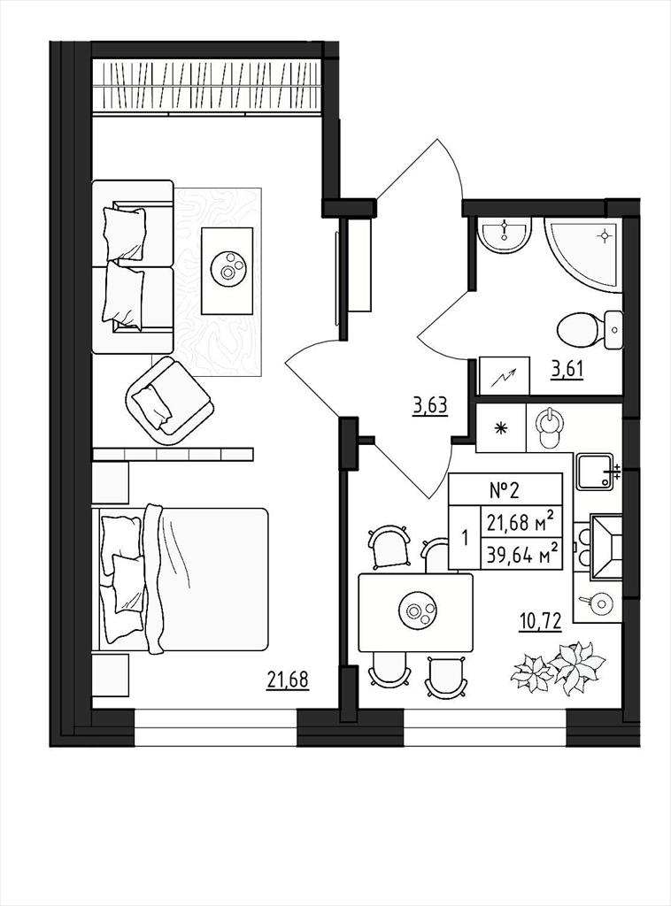 общая 39,64 м2, жилая 21,68 м2, кухни 10,72 м2 |